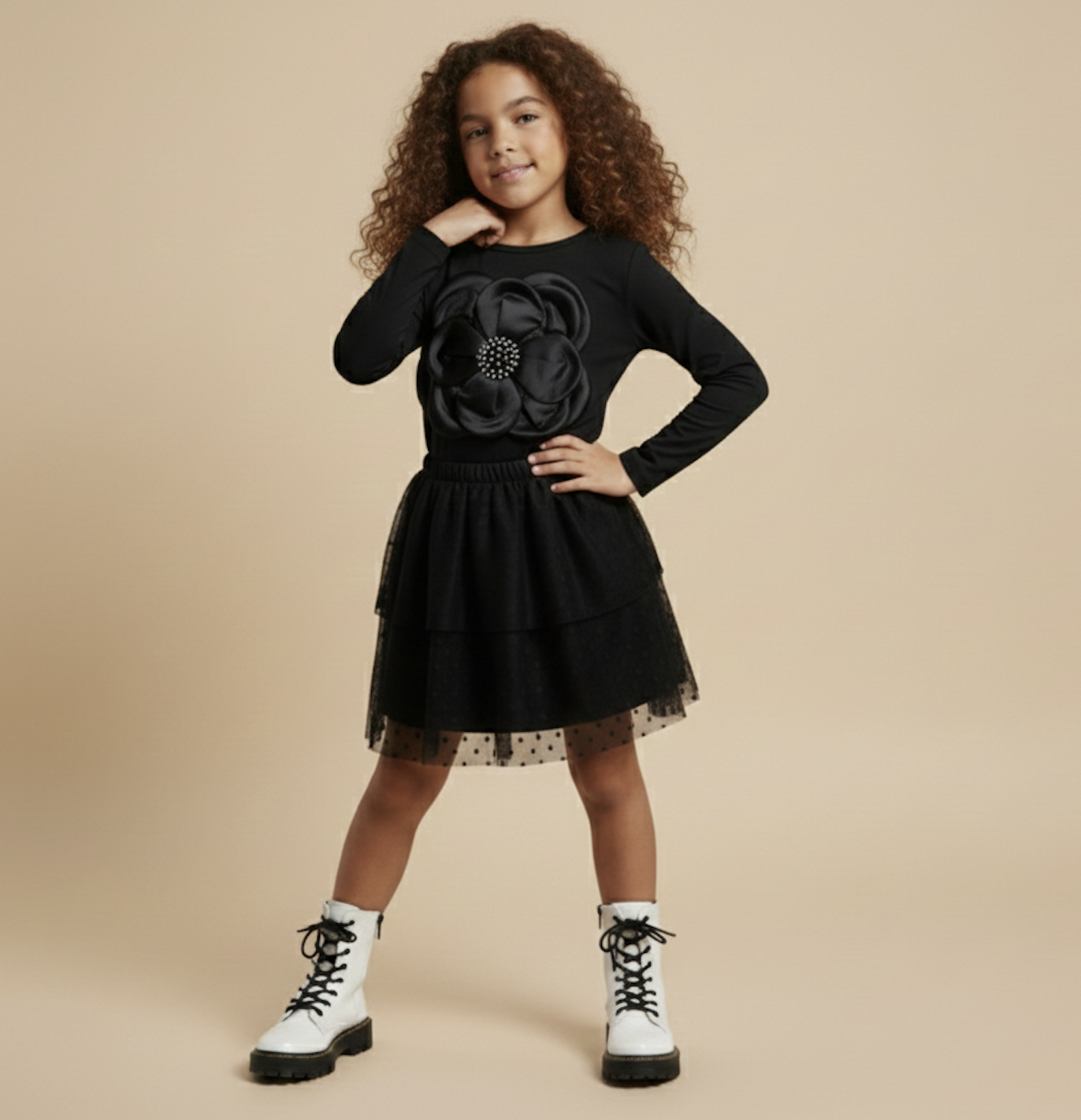 The classic black base makes it easy to style for both casual outings and special occasions, while the comfortable fit ensures all-day ease. A perfect blend of comfort and standout style for your little fashionista.