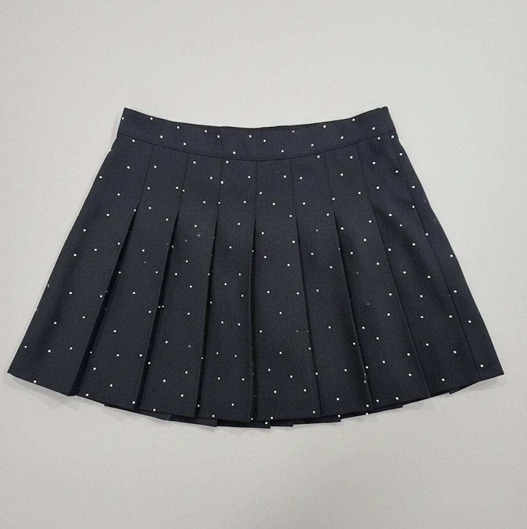 Shine with confidence in the Silver Spark Skirt, designed to bring together glamour and comfort. Crafted in a rich black fabric, this pleated skirt is beautifully adorned with delicate silver stone embellishments that add just the right amount of sparkle for a standout look.