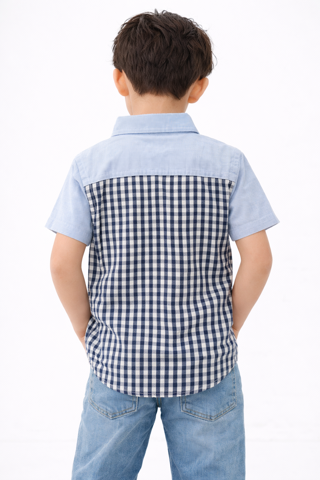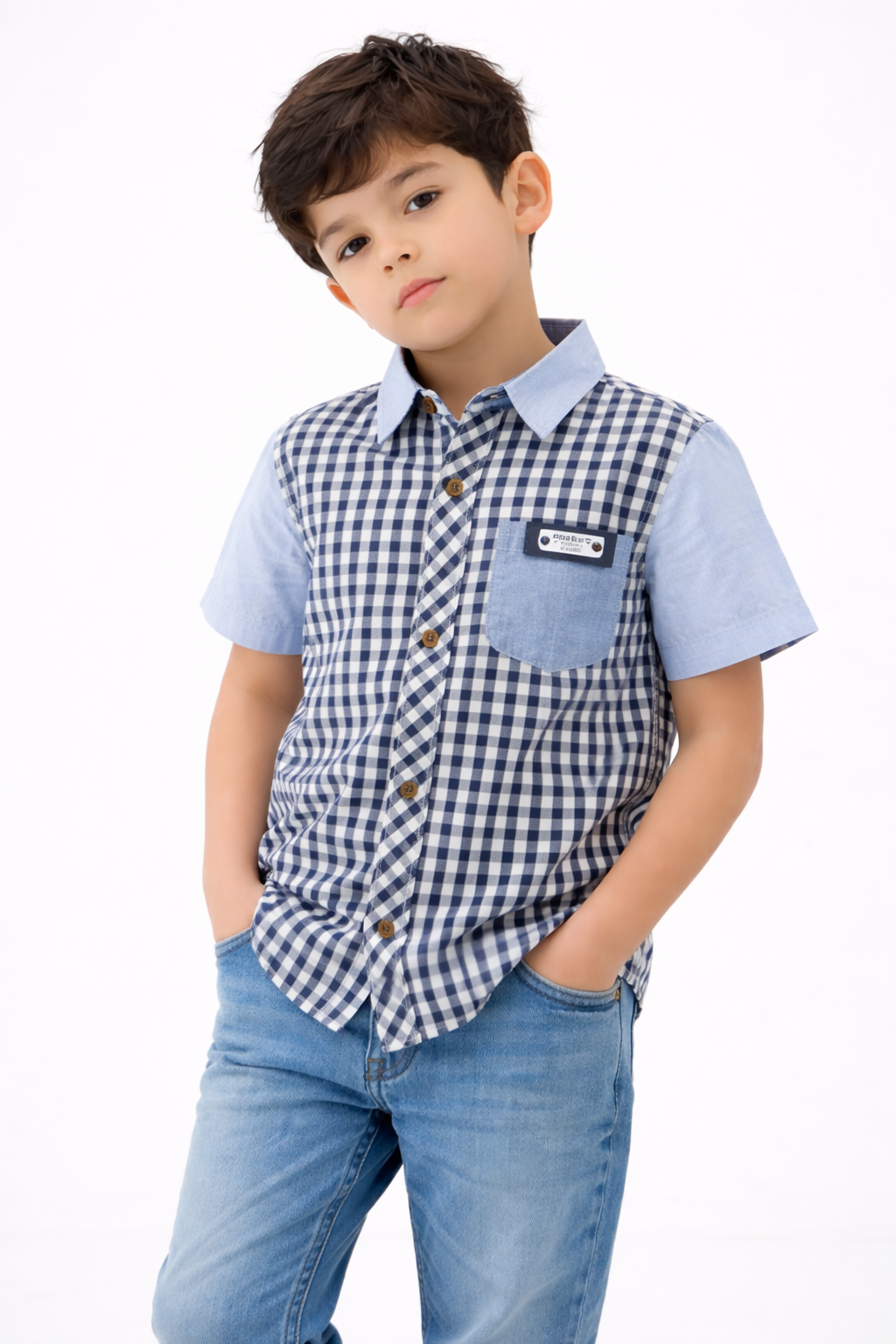 Let your little one step out in style with the SYKA Blueberry Check Shirt, designed for comfort, charm, and everyday adventures. Featuring a classic blue gingham check pattern with soft sky-blue sleeves and pocket detailing, this shirt blends playful style with a smart look.