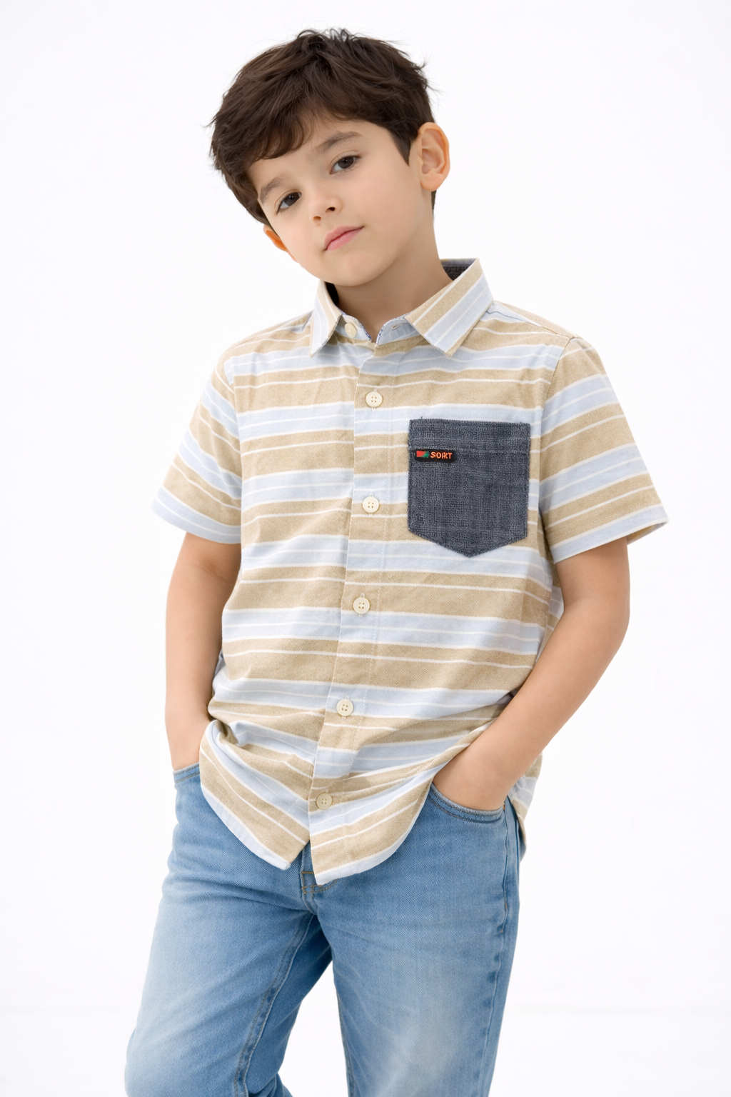 Give your little one a smart and stylish look with the SYKA Desert Sky Stripe Shirt. Inspired by warm desert tones and cool sky hues, this shirt features soft beige and light blue horizontal stripes that create a calm, modern style. The contrast dark pocket adds a trendy touch, making the shirt stand out while still keeping a classic look.