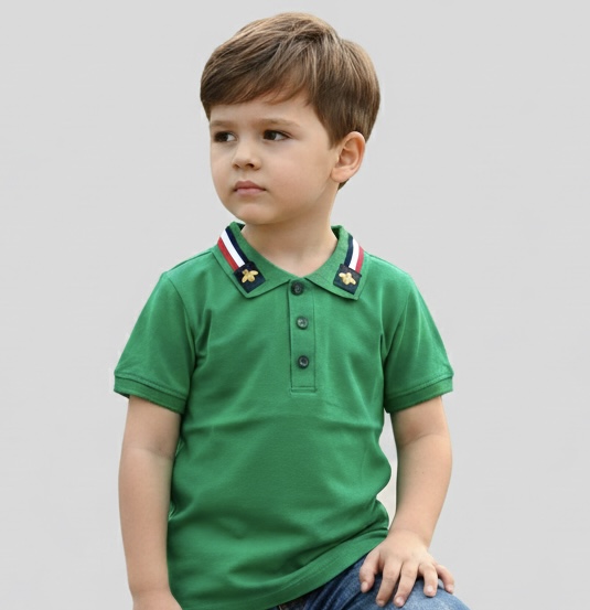 Crafted from soft, breathable fabric, this classic green polo is elevated with refined detailing—featuring a tricolour-accented collar and delicate bee embroidery that adds a touch of heritage charm.