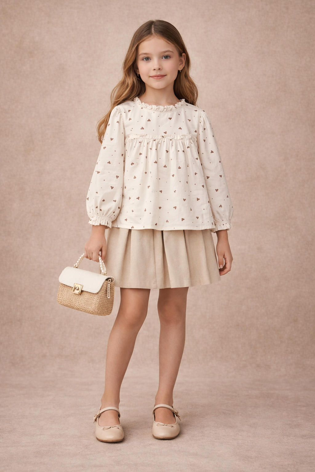 Print: All-over tiny heart print in subtle, earthy tones.