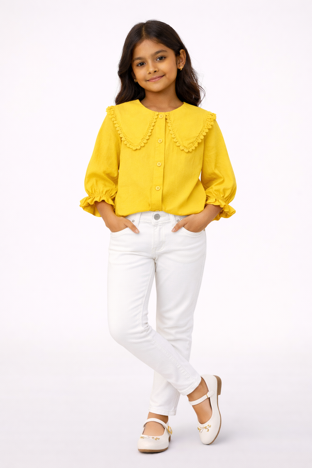 Crafted in a rich mustard hue, this charming top features a statement frill collar that brings a vintage-inspired touch to everyday dressing. The soft, breathable fabric ensures all-day comfort, while the gentle puff sleeves and front button closure make it easy to wear.