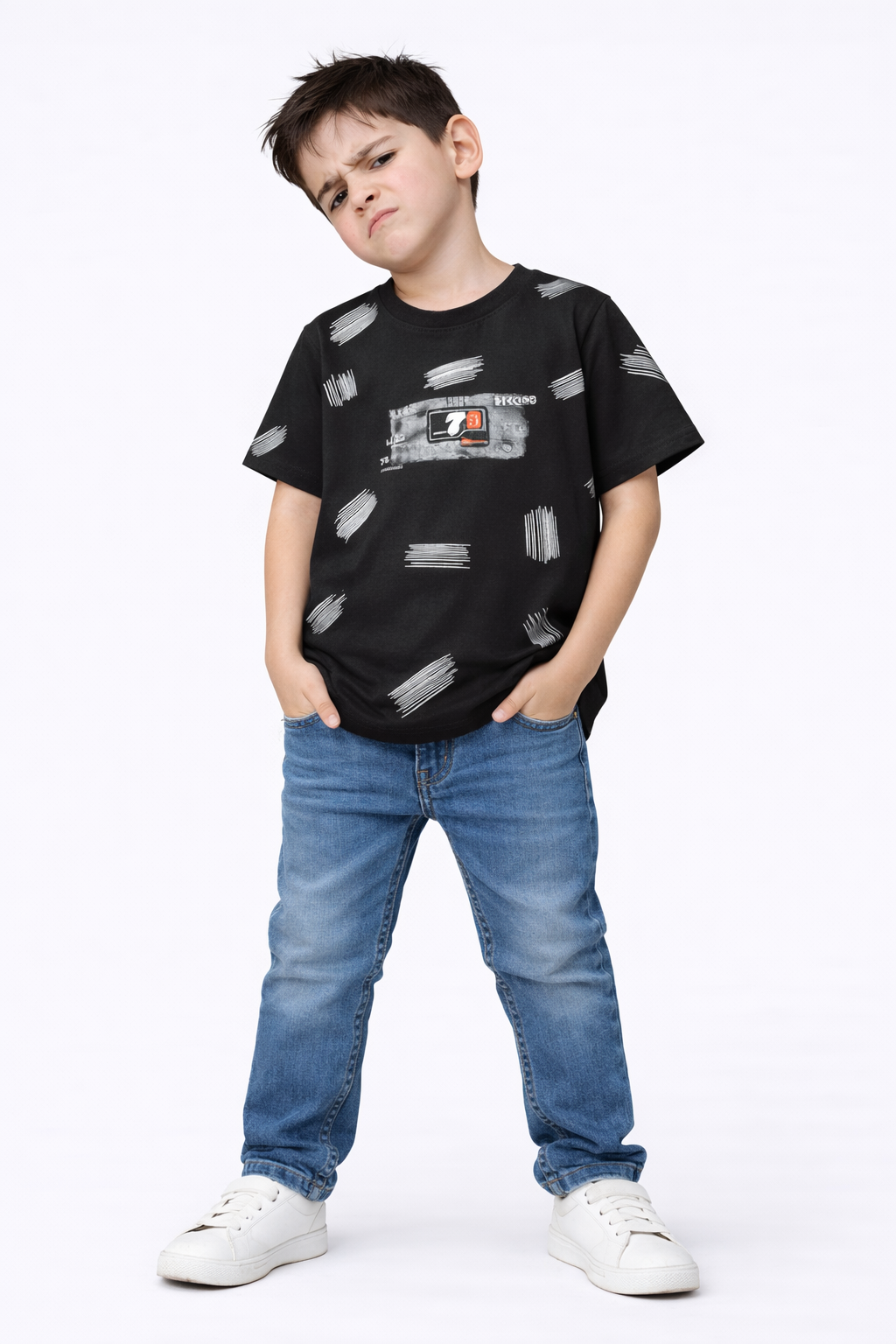 Bold, edgy, and effortlessly cool — the Night Street Tee brings urban street style to your child’s everyday wardrobe. Featuring abstract brush-stroke patterns on a deep black base with a modern graphic patch, this tee delivers a trendy, city-inspired look perfect for young style stars.