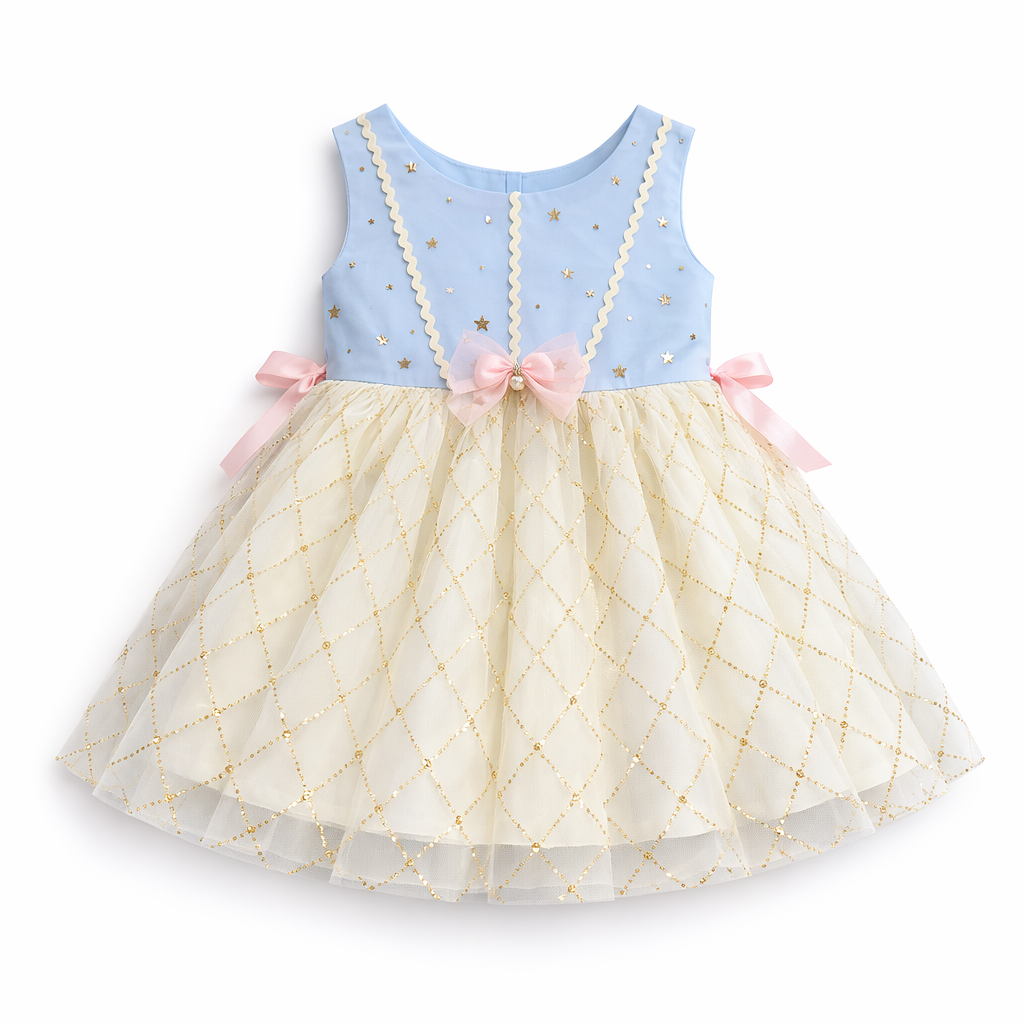 Featuring a soft pastel bodice adorned with delicate star embellishments and a glitter-accented tulle skirt, this dress blends elegance with playful charm.