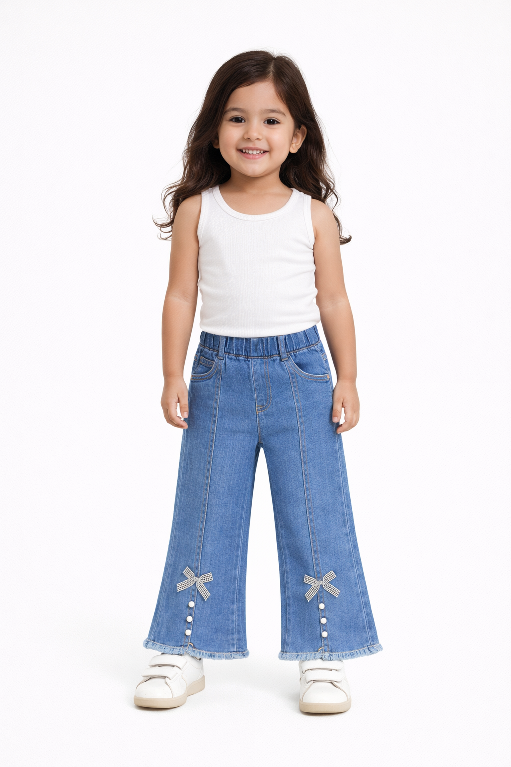 Crafted from soft yet durable denim, the jeans offer a comfortable elasticated waistband and a flattering flared silhouette that allows easy movement throughout the day. The pearl and bow embellishments add a refined charm, making this denim perfect for casual outings, parties, and special occasions.