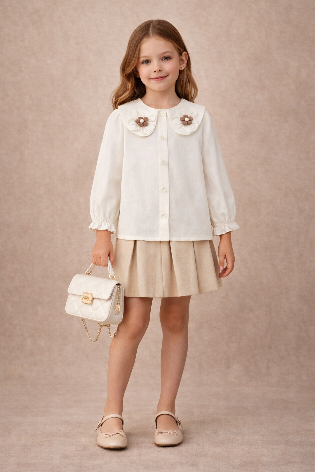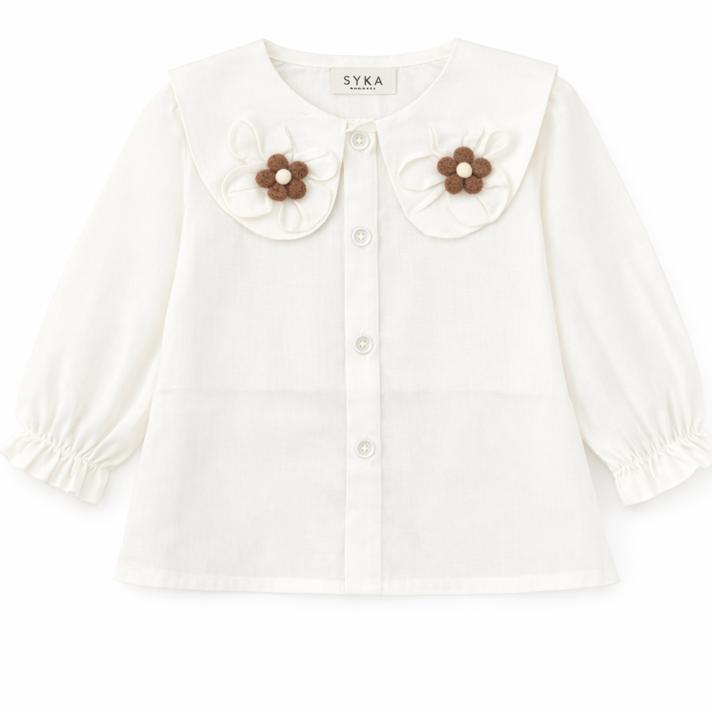 Delicate and timeless, the Ivory Petal Collar Top is designed to bring effortless elegance to your little one’s wardrobe. Crafted from soft, breathable fabric, this top features a statement scalloped collar adorned with charming floral appliqué details for a refined, vintage-inspired look.