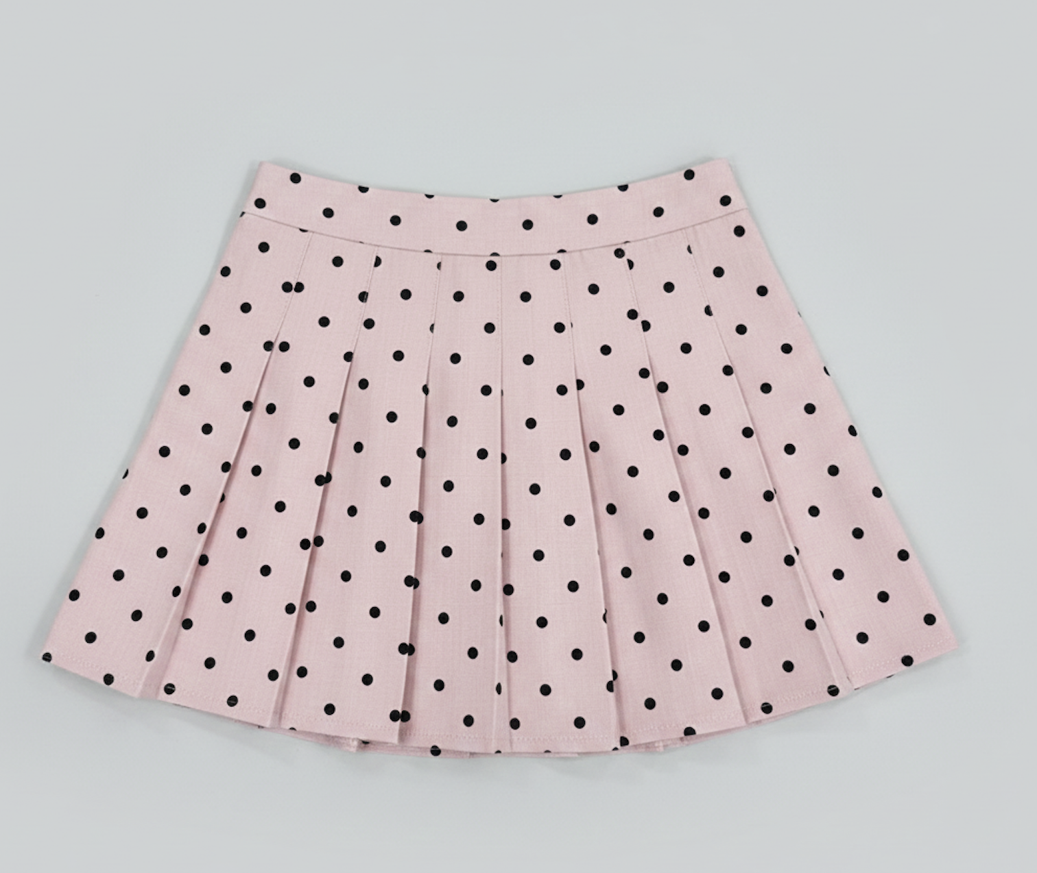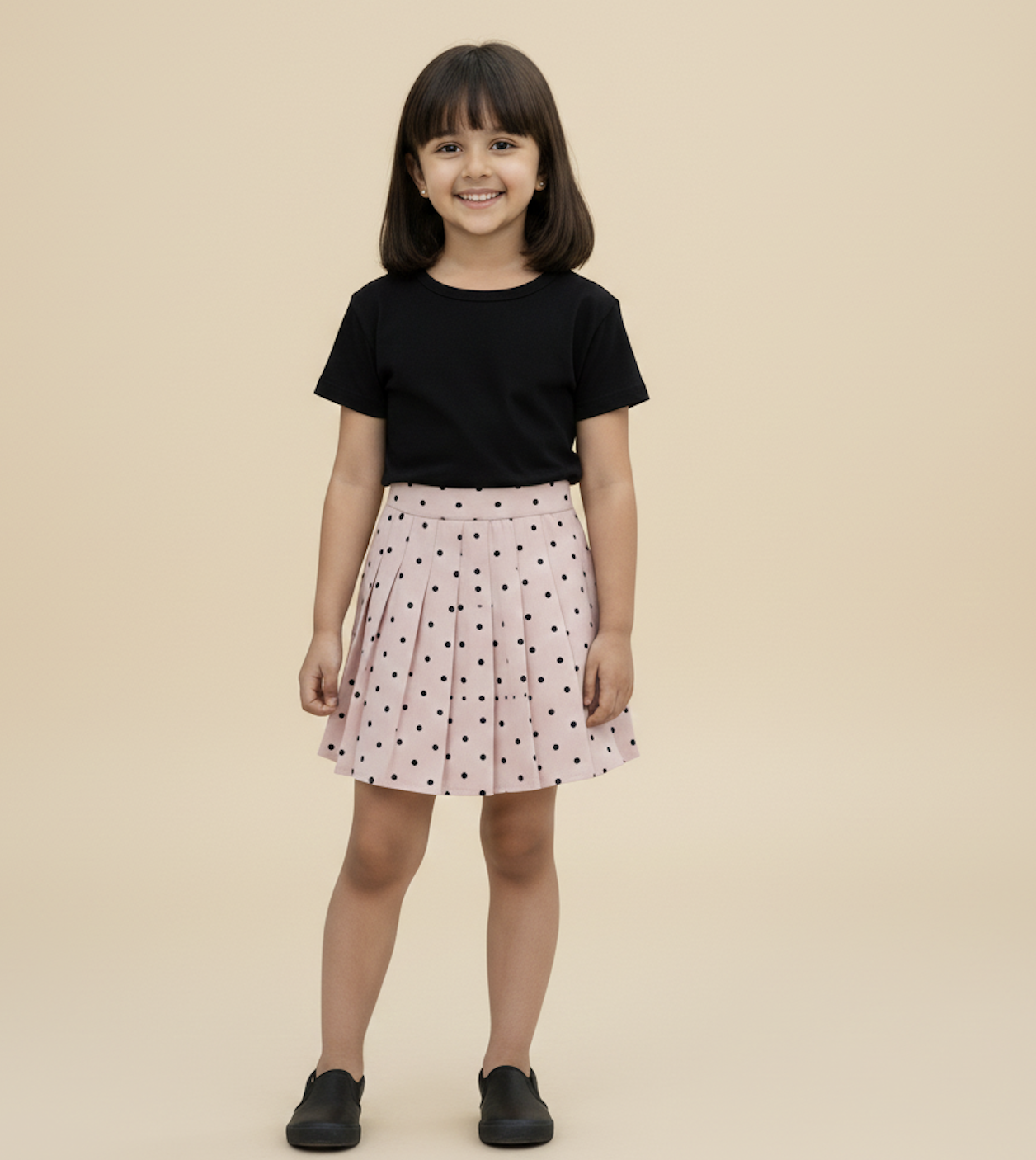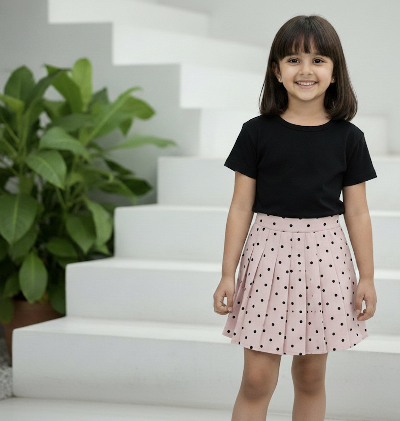 Bright, playful, and full of charm, the Chic Dots Skirt – Pink is designed to make everyday dressing fun and stylish. Crafted in a soft pink hue, this pleated skirt features a classic black polka dot print that adds a timeless yet cheerful touch.