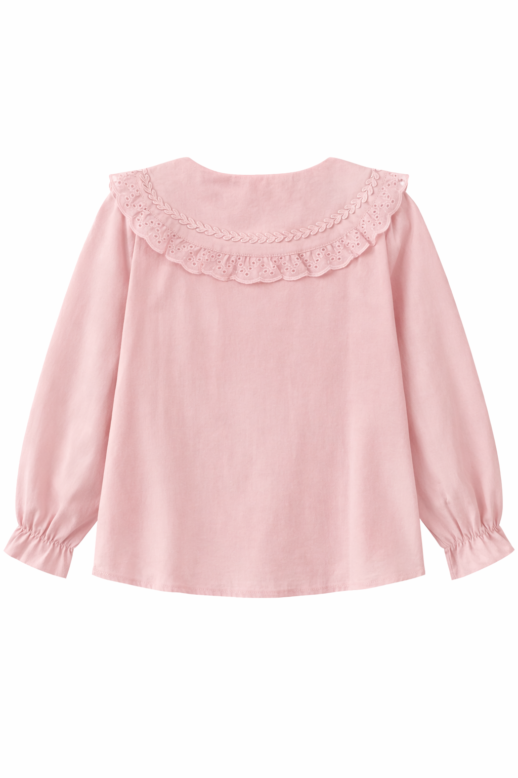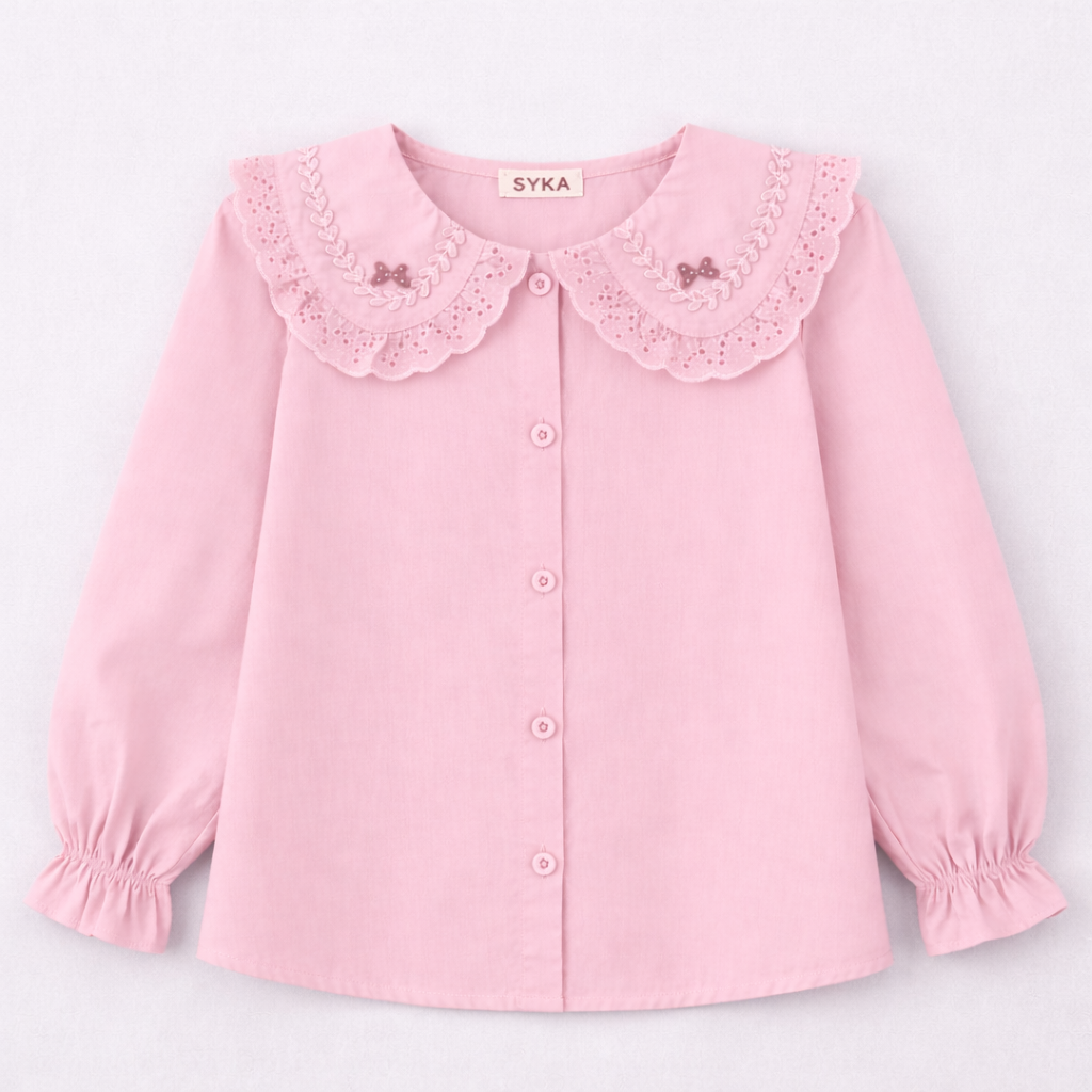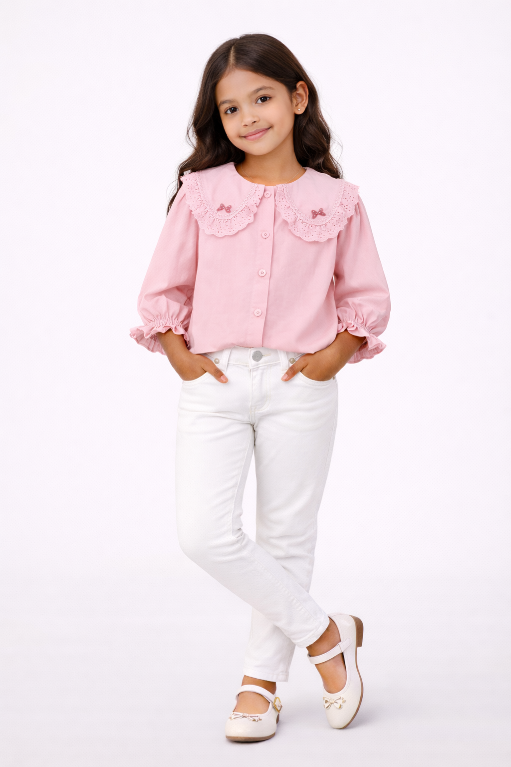 Delicate and dreamy, the Pink Sweet Petal Collar Top is designed to add a soft charm to your little one’s wardrobe. Crafted in a soothing blush pink tone, this top features a beautifully detailed scalloped collar with floral lace embroidery and dainty bow accents for a sweet, vintage-inspired look.