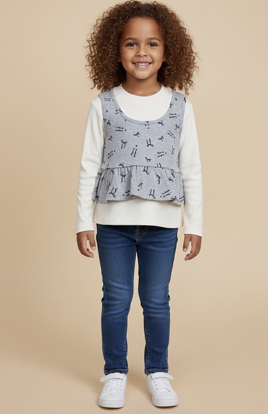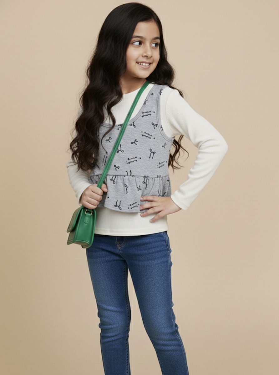 Add a touch of playful elegance to your little one’s wardrobe with the Grey Bow Peplum Layered Top.