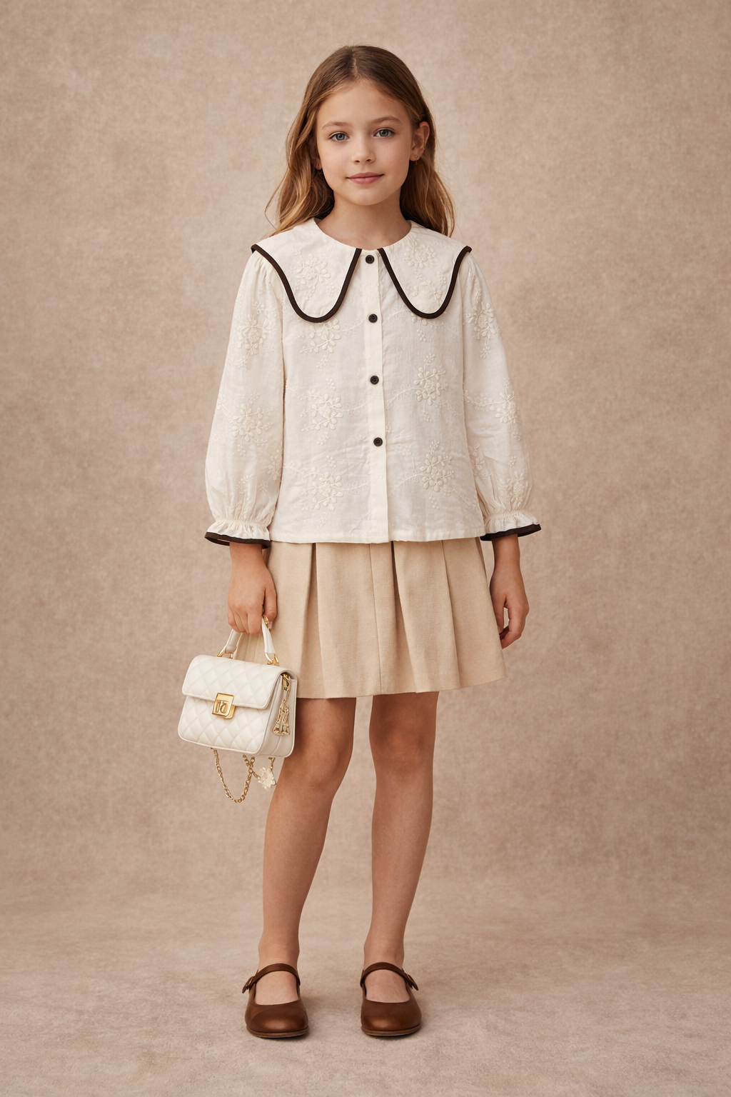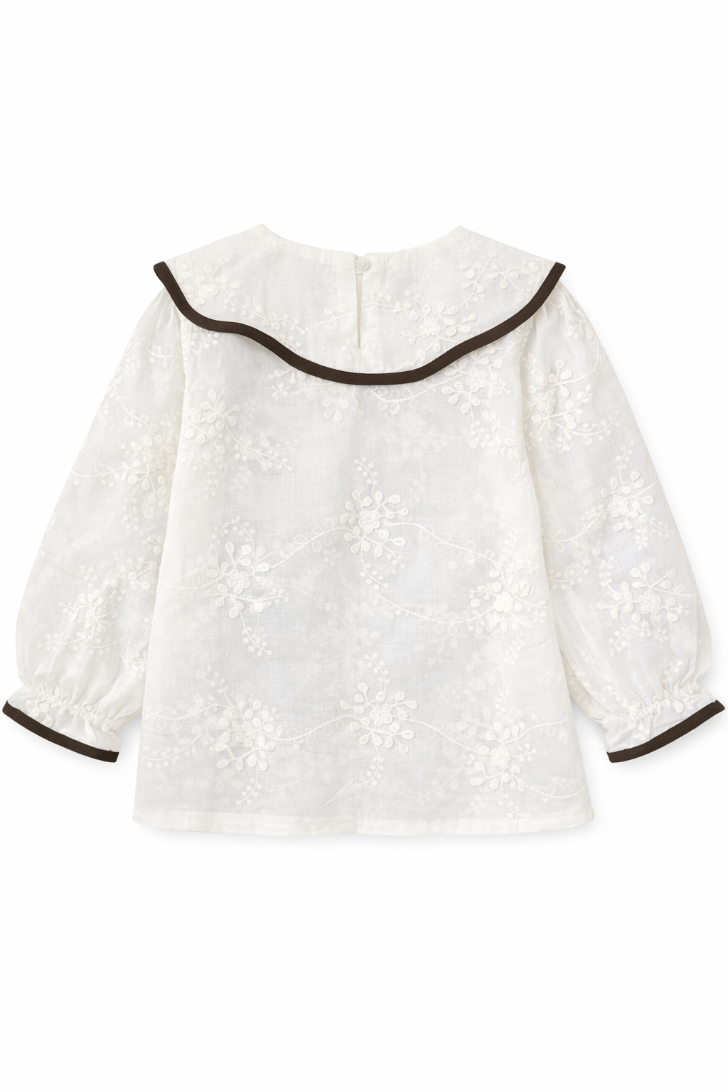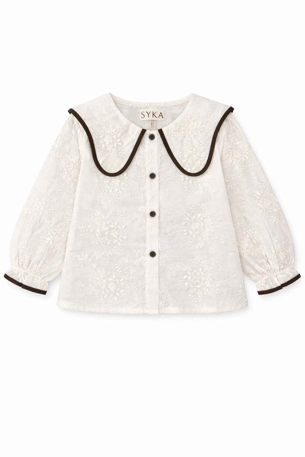 The SYKA Vintage Embroidery Shirt brings timeless elegance to your little one’s wardrobe. Crafted in a soft ivory tone, this beautifully designed shirt features delicate all-over embroidery and a statement contrast-trimmed Peter Pan collar, adding a charming vintage touch.